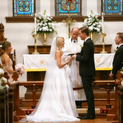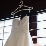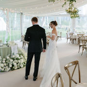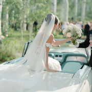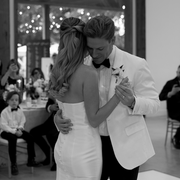 A few favorite details included their larger-than-life sweetheart table adorned in florals, the beaded detailing on the bride's dress, & their custom invitation suite featuring a hand painted sketch of the venue.